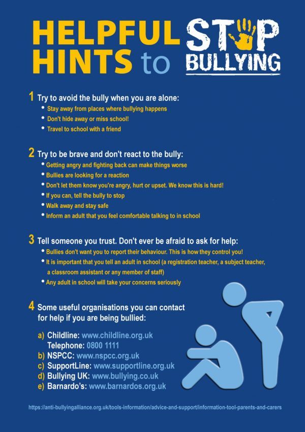 Bullying of any kind is unacceptable and if bullying does occur, all students should be able to tell someone at college so that incidents can be dealt with promptly and effectively.