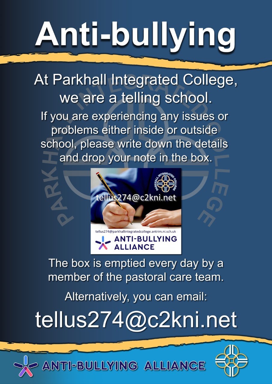 Students can talk to their Form Tutor, Head of Year or any member of staff. In addition, parents/guardians and students can report bullying or concerns by emailing: tellus274@c2kni.net. We are committed to working in close partnership with students, parents/guardians and outside agencies.